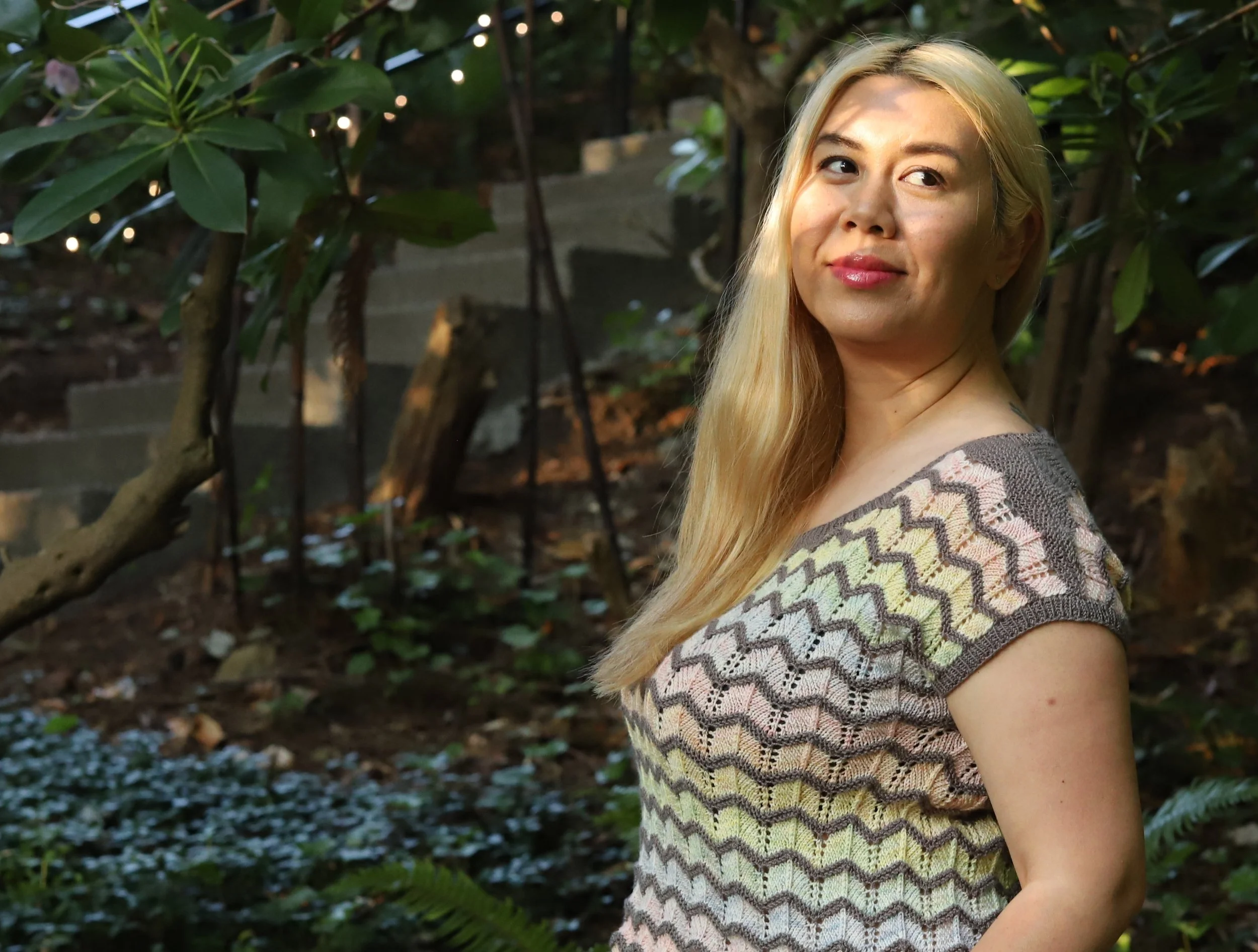 An Asian American woman with blonde hair stands looking to the left (facing the right side of the photo) while wearing a rainbow and grey knit tee.