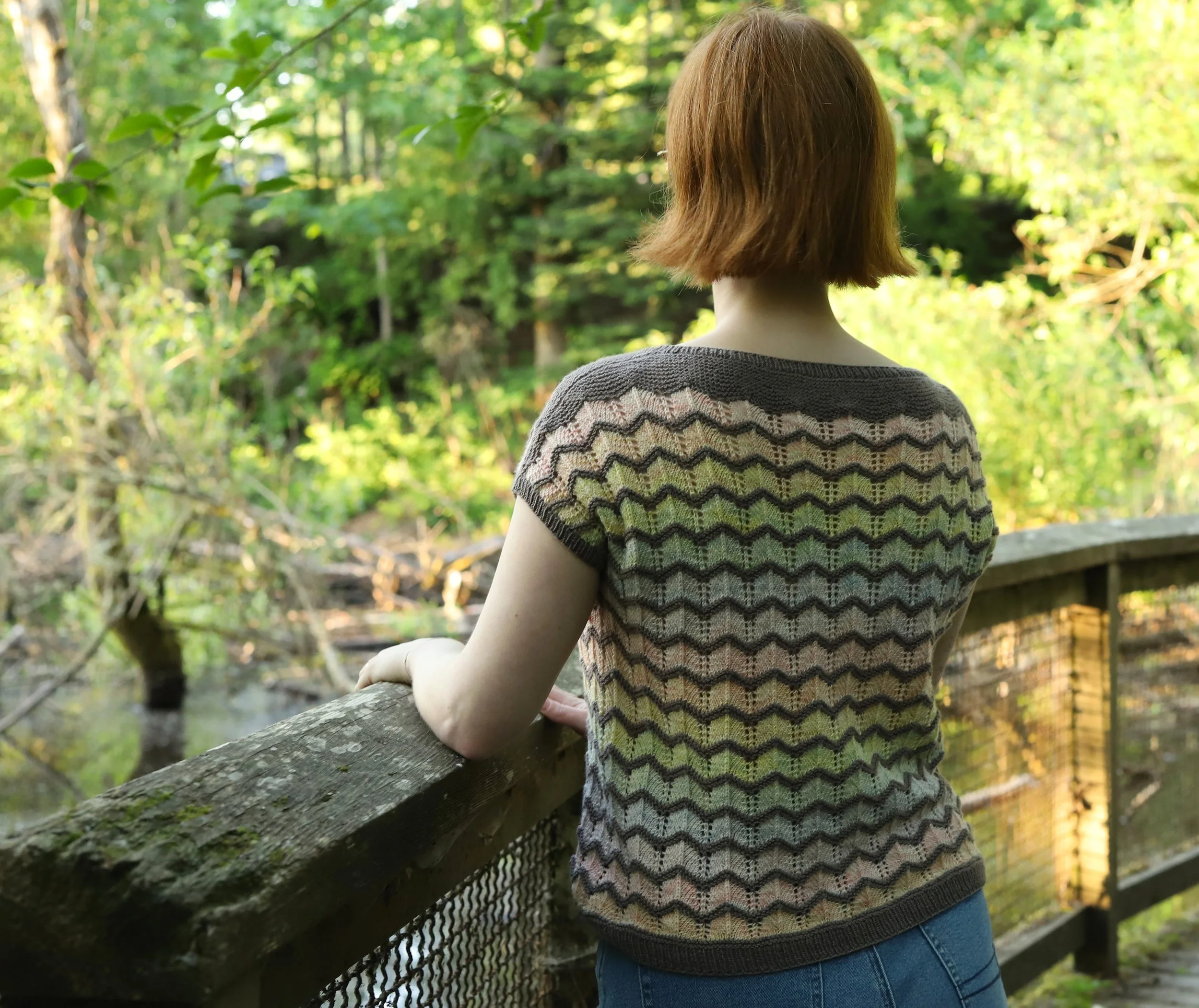 Above, my model is wearing the tee with roughly the 6” of positive ease built in. She is wearing a SIze 3 (meant to fit 36.5” full chest, and model is 37” full chest). The neckline is wide and scooped, and the sleeve style is drop sleeve. The upper back is shaped with a small number of short rows in garter stitch to raise the back neckline and create a small slope for the shoulders. The front shoulders mirror the back.