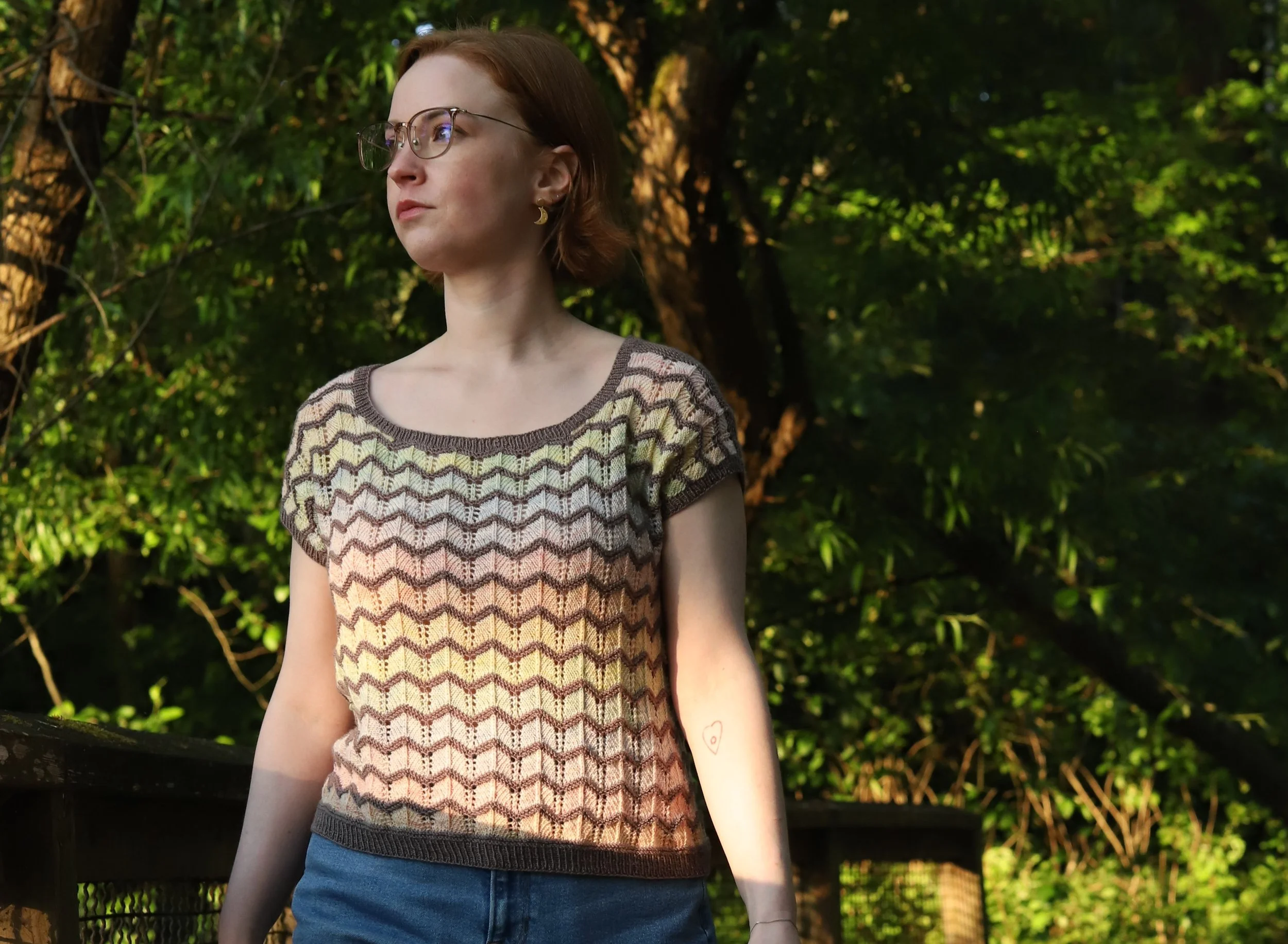 And now to get in to some more of the comments and suggestions. This tee was designed in collaboration with Yarn Matter for a semi-limited edition mini set using her Silk Sock base (85% merino, 15% silk; 492yds/[450m]/100g). While it was not fully exclusive to a kit, it does limit your ability to create this identical item as seen. Whether that limitation is that the color set is not available any longer, you want to use a different yarn, maybe you want to use a different fiber type. Maybe these colors are not your jam, but you’re still liking that pattern. Whatever the reason, I want to offer a few suggestions on your knit!
