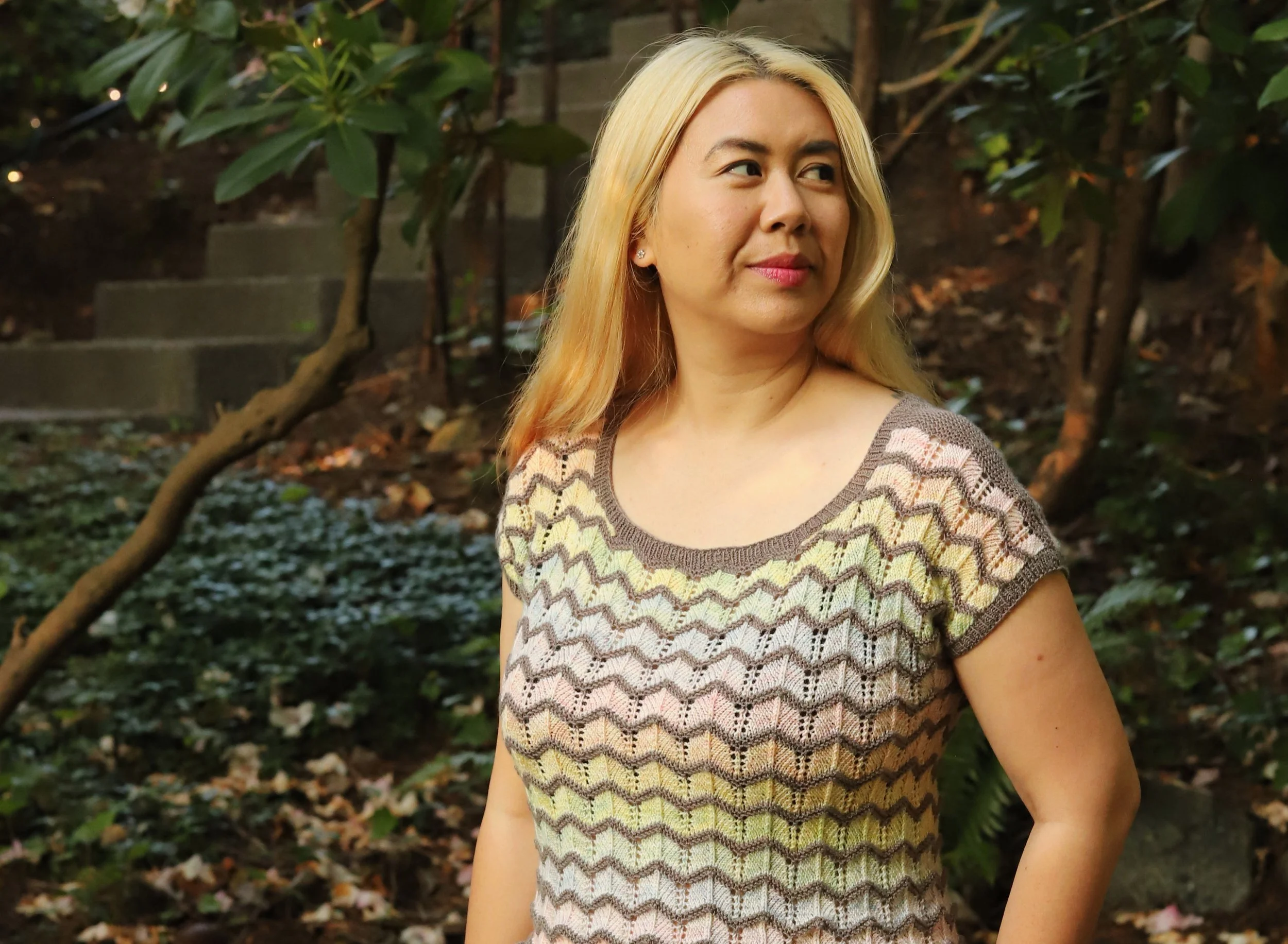 An Asian American woman with long, blonde hair is standing sideways with her head turned towards the camera. She is wearing a knit tee that has a gradient, pastel rainbow chevrons striped with thin, grey stripes. The background is greenery with a set of stairs to the left side.